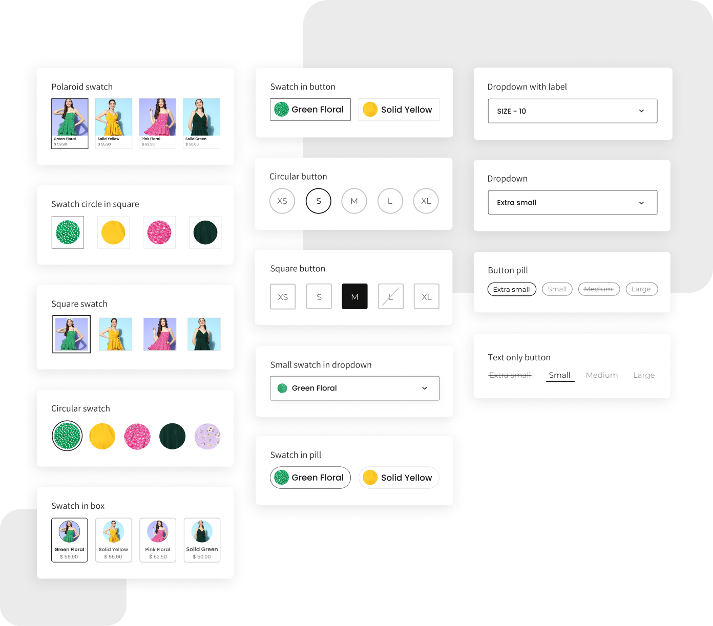 Swatch King offers a comprehensive library of pre-built dropdown, swatch, and button designs that can be quickly integrated into your Shopify store. These designs are carefully curated to provide an intuitive and engaging user experience while maintaining the visual coherence of your storefront.