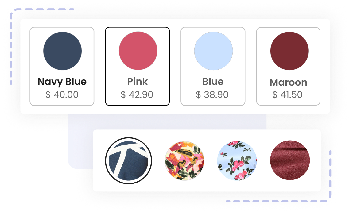 Color/ Custom SwatchesView ExampleProvide creative flexibility through our color/custom swatches. Choose hex colors or upload images (in bulk) to craft tailored shopping experiences and intricate designs.