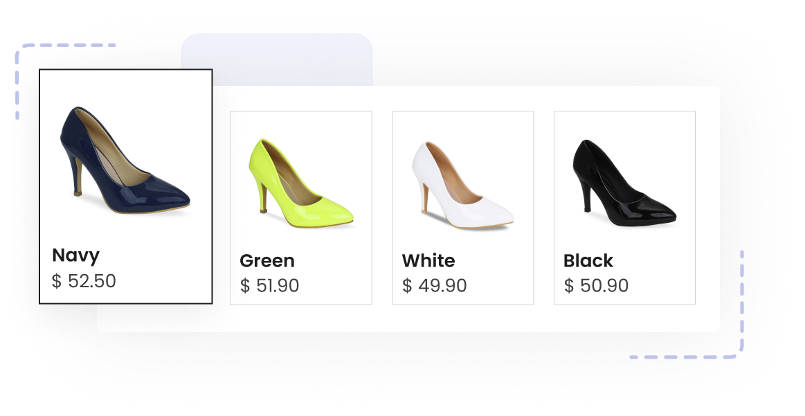 Variant Image Swatches with PriceView ExampleRevamp your product showcase by adding eye-catching swatches featuring variant pricing, simplifying the shopping journey and conserving valuable time for your customers.